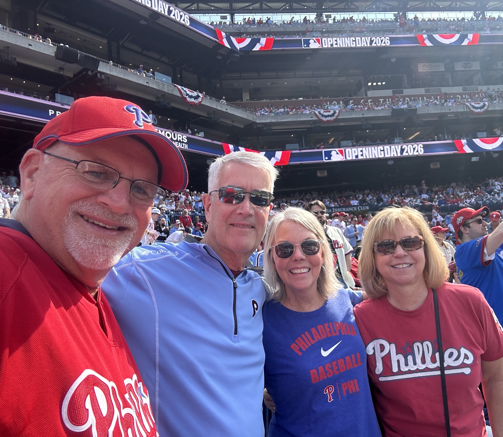 I went to the Philadelphia Phillies Opening Day game yesterday. It was my wife’s First opening game that she had ever attended. My wife is in the red Phillies tee shirt on the right. She is a born and raised Indiana Hoosier, but has adopted the Philadelphia teams after living here for over 35 years. I had attended an opening game as a guest a number of years ago. This was the first time for me as a host. I had four tickets, four rows behind the Phillies dugout and invited a lifelong friend and his wife to join us. And they WON 5 to 3! What made it even better was the seventy-degree weather with sunshine on a March Day in Philly! Unheard of. It is usually in the forties, maybe fifties if lucky. It was a perfect day, with great friends, in unusually great weather – with a win.